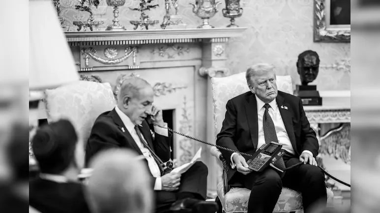 Bilden visar en trumpen Trump när han tvingar Netanyahu ringa Qatar och framföra sin ursäkt. Notera att han har telefonen i knät.