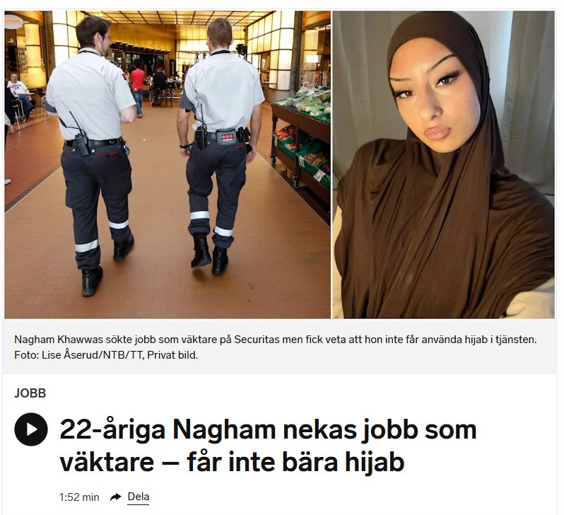 Den här artikeln i SR har valsat runt några dagar. Storyn är enkel. Hon nekades jobba som Securitasvakt i hijab, folk blev förbannade och Securitas överväger nu att ändra sin policy.