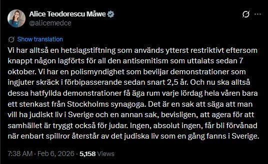 Men Sverige har åtskilliga judar som också avskyr Israels dåd, och som går i tågen. Hennes tankefigur att judar i Sverige generellt inte ska klara av att beskåda kritiken mot ett helt annat land bara för att dessa delar religion med majoriteten av det landets folk är helt absurd. Som om svenskar boende i Frankrike skulle bli ledsna över kritik mot exvis UK bara för att de också är protestanter.