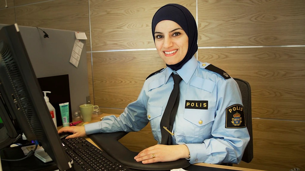 Bilden visar Donna Eljammal, Sveriges första polisaspirant i hijab.