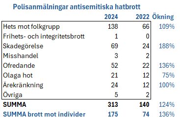 Jag gick igenom Brottsförebyggande rådets (BRÅ) rapporter gällande polisanmälningar med antisemitiska motiv för 2024 och 2022. Ni ser resultatet i tabellen.