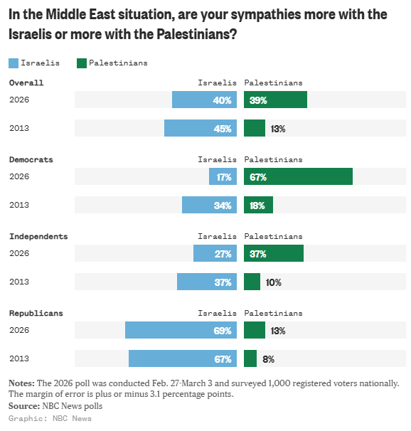 Dels kan han läsa opinionsundersökningarna. Palestina har nyss gått om Israel vad gäller sympatier, och när det gäller demokratiska väljare, som han ju måste förbi för att knipa nomineringen om två år, känner bara sjutton procent sympatier för Israel.