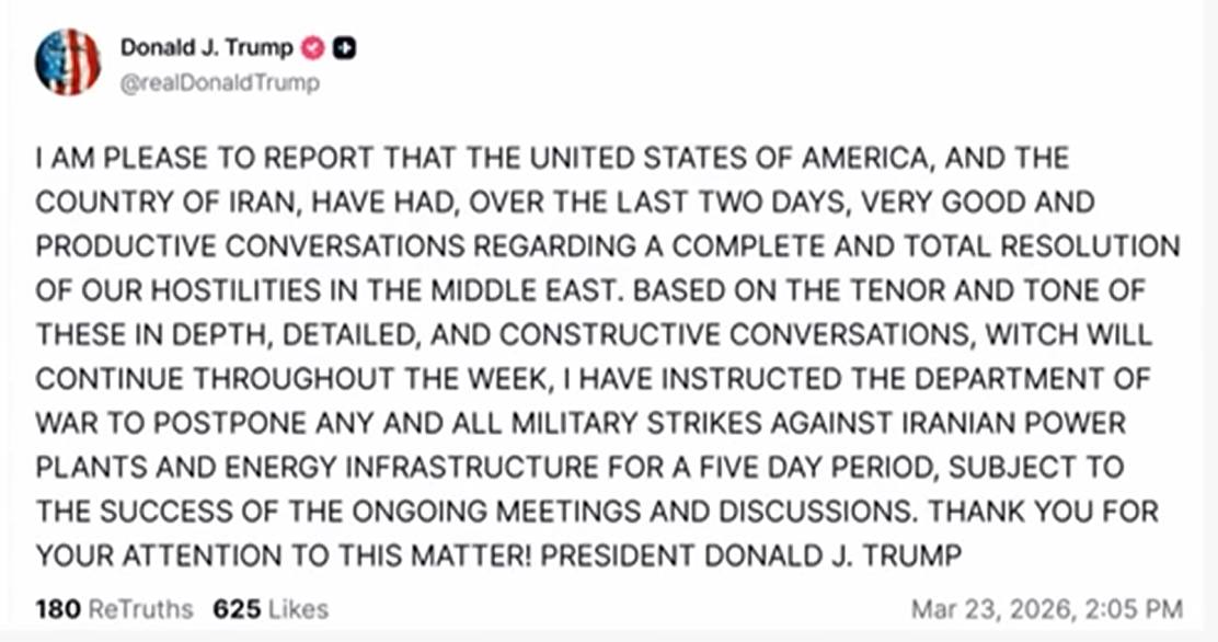 Och nu, efter att han givit Iran en 48-timmarsfrist innan han bombar sönder deras oljefält och därmed sänker hela världsekonomin, ringer de, han vill inte avslöja vem, men någon från Iran i alla fall, och säger ”snälla farbror presidenten, låt oss göra en deal!”.