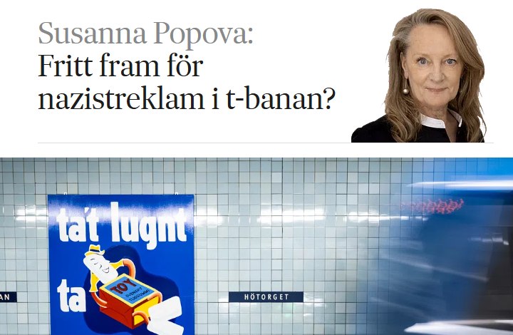 Under rubriken ”Fritt fram för nazistreklam i T-banan” beskriver Susana Popova i en ledare i SvD hur hon chockades när hon i godan ro klev in i tunnelbanan och där fanns reklam för organisationen Islamic Relief.