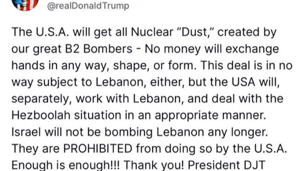 Trump får väldigt sällan beröm av mig, men jag skrattade för mig själv när han skrev att Israel inte kommer att attackera Libanon mer – eftersom han förbjudit dem att göra det.