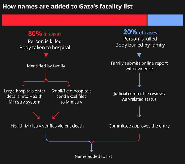 Det finns två vägar genom vilka en person kan föras in i listan. Den första, och vanligaste, står för cirka 80 procent av fallen. En person dödas, kroppen samlas upp eller dras ur spillrorna och transporteras till ett sjukhus. Familjen anländer, identifierar den avlidne och lämnar namn och ID-nummer till hälsoministeriet. Varje 24:e timme lägger vi till nya uppgifter””, säger al-Wahidi. ””Vi verifierar med sjukhusledningarna att det verkligen är fall som endast involverar våldsamma dödsfall relaterade till kriget.””