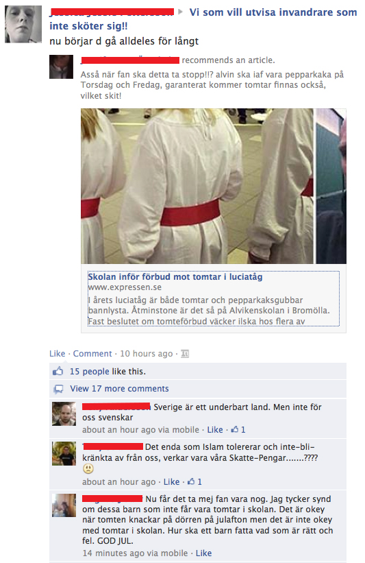 Det underliggande budskapet är att muslimer kommer hit och kräver stopp för lucior och tomtar, och vi är mesiga och lägger oss platt. De antas hata Sverige och svenska traditioner, och de vill helst svepa in oss alla i burkor istället för lusselinnen.